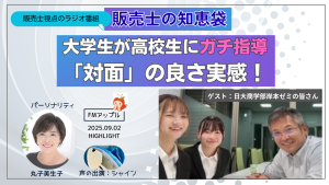 日本販売士協会は10月7日、日本で唯一の販売士視点のラジオ番組「販売士の知恵袋」(FMアップル)第11回放送(9月2日)のハイライト動画をYouTube「販売士チャンネル」で公開した。当日のゲストは日本大学商学部の岸本徹也教授と岸本ゼミの星美音さん、小林清香さんの3人。番組では、同ゼミの学生が毎年企画・運営を担っている高校生のマーケティング力を競う全国大会「リテールマーケティング・コンテスト」(通称リテコン、今年は11月15日に開催予定)の内容などを紹介した。