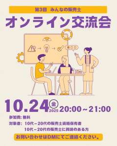 「みんぱん」は、全国各地の10~20歳代の販売士に交流と学びの場を提供し、「みんなの販売士」の輪を広げていくコミュニティとして今年8月に設立。オンライン交流会の参加費は無料。定員は20人(先着順)。問い合わせ、参加申し込み等は公式InstagramのDMで事前に受け付ける。