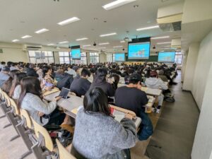 福岡販売士協会は11月13日、福岡県福岡市の西南学院大学(担当教員:松田温郎商学部教授)で「コミュニケーションスキルを磨こう!」をテーマに特別講義を実施した。講師は、日本販売士協会登録講師(1級販売士)の増本清高氏(福岡販売士協会理事)が務め、商学部の2、3、4年生約300人が出席。販売士に求められるコミュニケーションスキル、企業内コミュニケーションの実態、消費者の実店舗回帰の動き、アルファ世代の特徴等について、地元の生鮮スーパーの実際の取り組み事例を交えながら解説した。