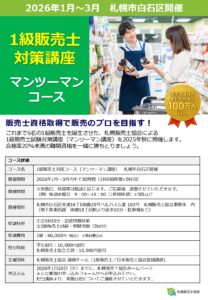 札幌販売士協会はこのほど、2026年1~3月に札幌市、北広島市で開催する「1級販売士対策講座(マンツーマンコース)」と「2級・3級販売士養成講習会」の受講者の募集を開始した。講師は、これまで多くの合格者を輩出してきた同協会会員で日本販売士協会登録講師(1級販売士)が担当。1級講座は難関資格突破に向けて実績のあるマンツーマン指導、2級・3級の講習会は、予備試験合格等など一定の条件を満たすと、コース修了時に「販売・経営管理」科目の免除の特典があるほか、100問超える演習問題をプレゼントする。