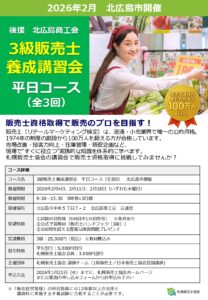 「3級販売士養成講習会」(全3回:平日コース、北広島商工会後援)は2月4日、11日、18日(いずれも水曜日)に北広島市の北広島商工会で開催する。開催時間は9時30分~15時30分(5時間×3日間)で受講費用は2万5000円(税込み、※教材費込み、割引制度あり)。申込締め切りは1月21日。