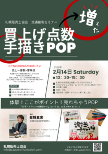 札幌販売士協会はこのほど、2月14日に札幌市中央区で開催する25年度流通接客セミナー「買上げ点数増えた!手描きPOP」の参加者募集を開始した。講師は日本販売士協会登録講師(1級販売士)でPOP広告クリエイターの星野真実氏(札幌販売士協会理事)。セミナーでは、マーカーを使った簡単な手描きPOPを体験してもらうとともに、POPで買い上げ点数を増やすヒント、買いたくなってしまうカラーワードなどを解説し、売上と利益に直結する「アイキャッチ力のあるPOP術」を伝授する。参加費は無料(定員20人)で申込締切は2月11日。