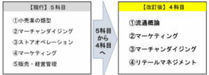 現在、2・3級の科目免除制度については、科目体系及び科目名の一部変更に伴い、免除科目の名称は「販売経営管理」から「リテールマネジメント」に変更となる。新体系への移行期(2028年度~)における1級の科目合格制度については、特に新科目「マーチャンダイジング」に注意が必要。新科目「マーチャンダイジング」の免除を受けるには、旧試験において「マーチャンダイジング」と「ストアオペレーション」の両方の科目合格(2028年4月~2029年6月の期間内)が必須となる。それ以外の科目は、対応する新科目で免除が適用される(例:「小売業の類型」合格 →「流通概論」免除等)。