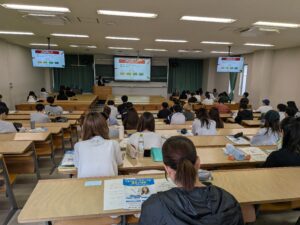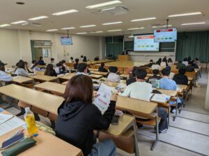 当日は経営学部の河田賢一教授のもと、約60名の受講生が参加。「キャリアデザインと販売士検定」をテーマに、就職活動における販売士資格の活用方法や、入社後のキャリアデザインを中心に解説が行われた。